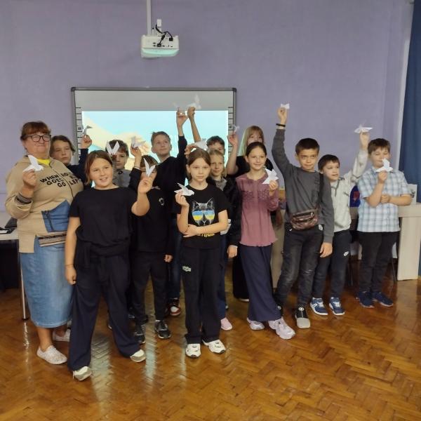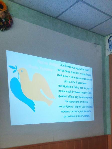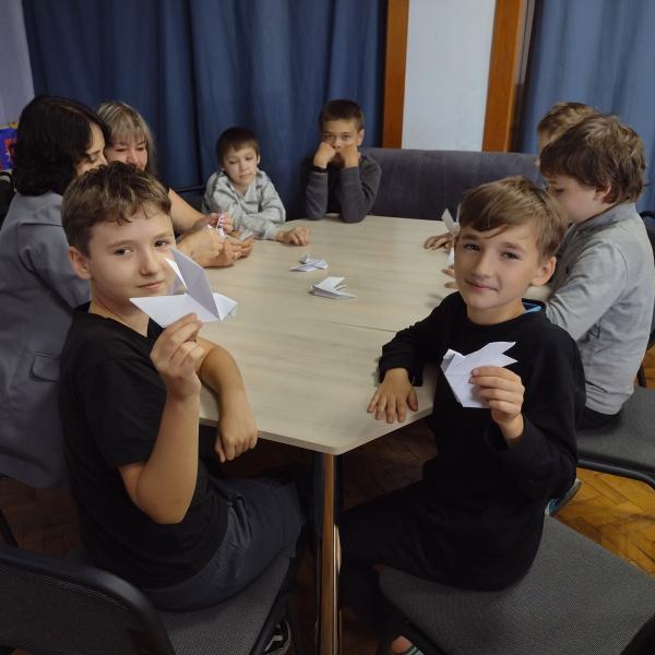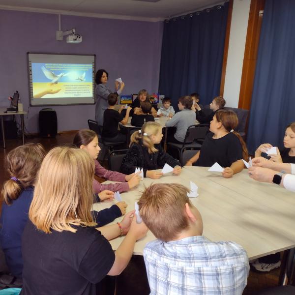 Бібліотекарі відділу обслуговування учнів 5 – 9 класів теж провели два заходи – у межах книгозбірні й на виїзді. Пізнавальну відеогодину з майстер-класом «У долоньках наших – голуб миру» в бібліотеці відвідали учні 5-Б класу ЗОШ № 6. Для учнів 6 класу ЗОШ № 5 працівники відділу провели цей же захід безпосередньо на території навчального закладу. Після розповіді про сутність й історію Міжнародного дня миру бібліотекарі допомагали дітям створити голуба миру в техніці оригамі.