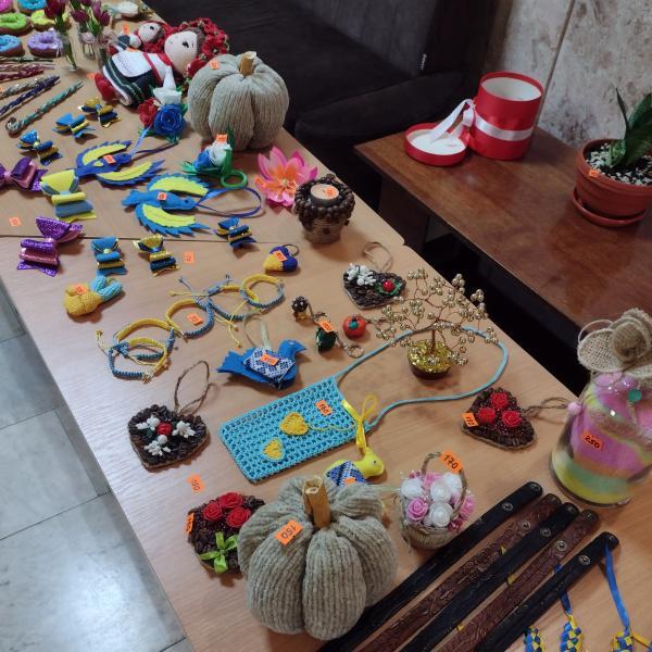У цей день у холі бібліотеки також запрацював благодійний ярмарок хенд-мейду «Бібліокреатив – на допомогу ЗСУ». Сувеніри ручної роботи, ляльки, прикраси, написані й вишиті картини, мило й свічки та багато інших гарних товарів виготовлені власноруч працівниками книгозбірні. Також свої полотна на продаж віддала керівник колективу сучасної хореографії, зразкового шоу-гурту «Анфас» Центру дитячої та юнацької творчості Світлана Патлань. Значну частину виробів ще можна встигнути придбати – ярмарок працюватиме до кінця цього місяця. Усі зібрані кошти будуть передані на потреби Збройних Сил України. Тож запрошуємо придбати ексклюзивний товар і підтримати нашу ініціативу з допомоги військовим.
