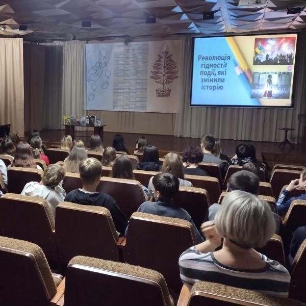 Відділ обслуговування учнів 5 – 9 класів організував для своїх користувачів хроніко-документальний екскурс «Народ мій є! Народ мій завжди буде!». У його основу лягли короткі історичні довідки щодо кожного етапу розгортання драматичних подій на Майдані на початку нульових і десятих, їхніх політичних передумов і наслідків. А ще огляд художніх і документальних книг і фільмів про обидві революції. Окремі видання бібліотекар також представила на обов’язковій для такого формату заходів книжковій викладці – за їх допомогою читачам пропонували розширити й поглибити свої знання з теми вже після завершення спілкування. Учасниками екскурсу в період з 18 по 21 листопада стали учні 8-А, 8-Б класів ЗОШ № 5, 9-А, 9-Б, 10-А, 10-Б класів ЗОШ № 22, 7-Б класу Першої міської гімназії.