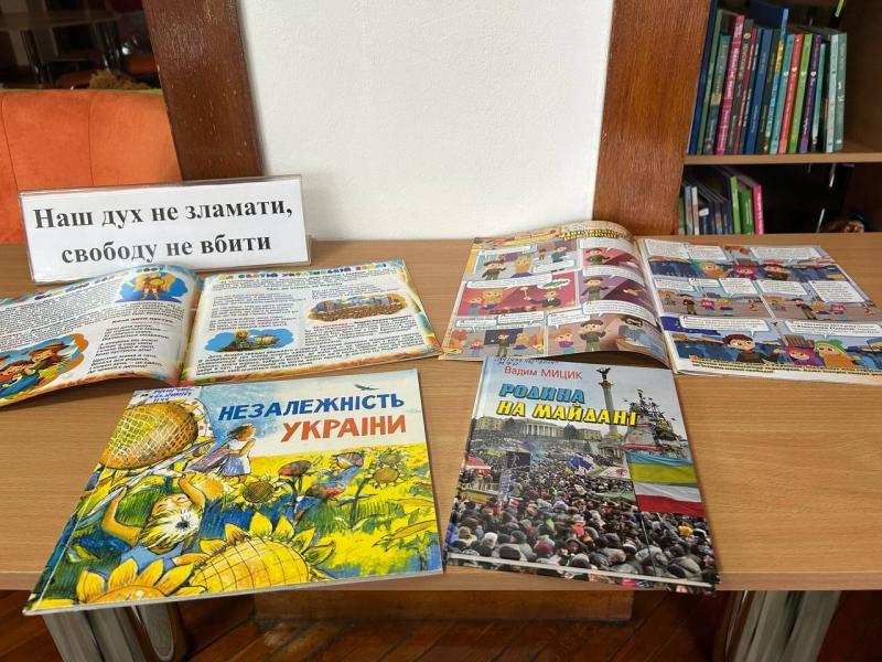 У відділі обслуговування дітей дошкільного віку та учнів 1 – 4 класів до Дня Гідності та Свободи було підготовлено тематичну поличку «Наш дух не зламати, свободу не вбити». Вона представляла літературу, з якої найменші читачі можуть дізнатися важливу інформацію про обидві революції в доступній та прийнятній для їхнього віку формі, для дорослих же ці видання стануть підказкою, у якому аспекті краще обговорювати складні теми з малечею.
