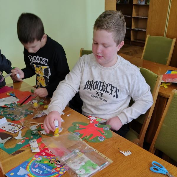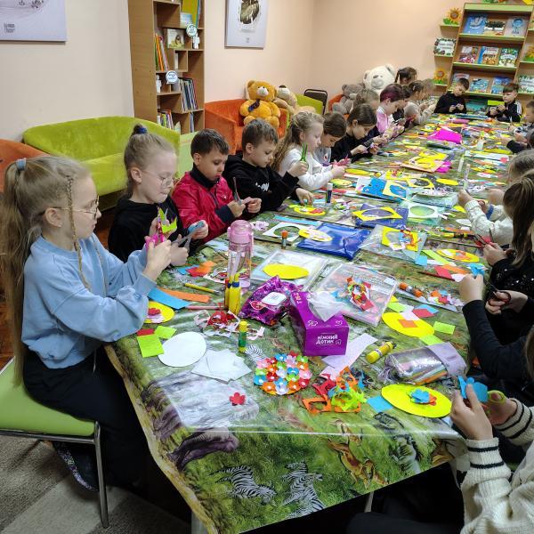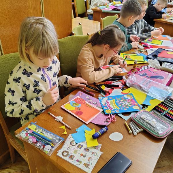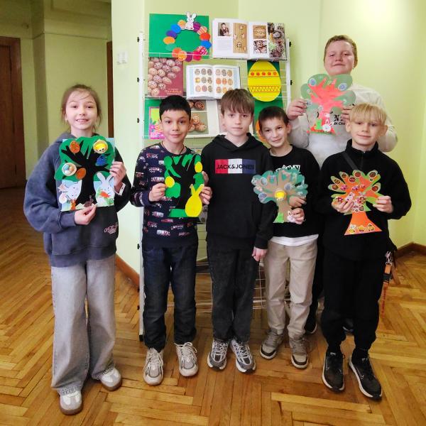 Кольоровий папір і картон як основні матеріали для творчої роботи читачів обрали й у відділі масової роботи та естетичного виховання. Для учнів 4-Б класу СПШ № 3 й 3-А класу Першої міської гімназії тут організували майстер-клас «Великодні фантазії». Перша група дітей майструвала святкову інсталяцію з паперовими й картонними деревом, крашанками та великодніми кроликами. Друга група виготовляла вітальну листівку доречного до свята вигляду.